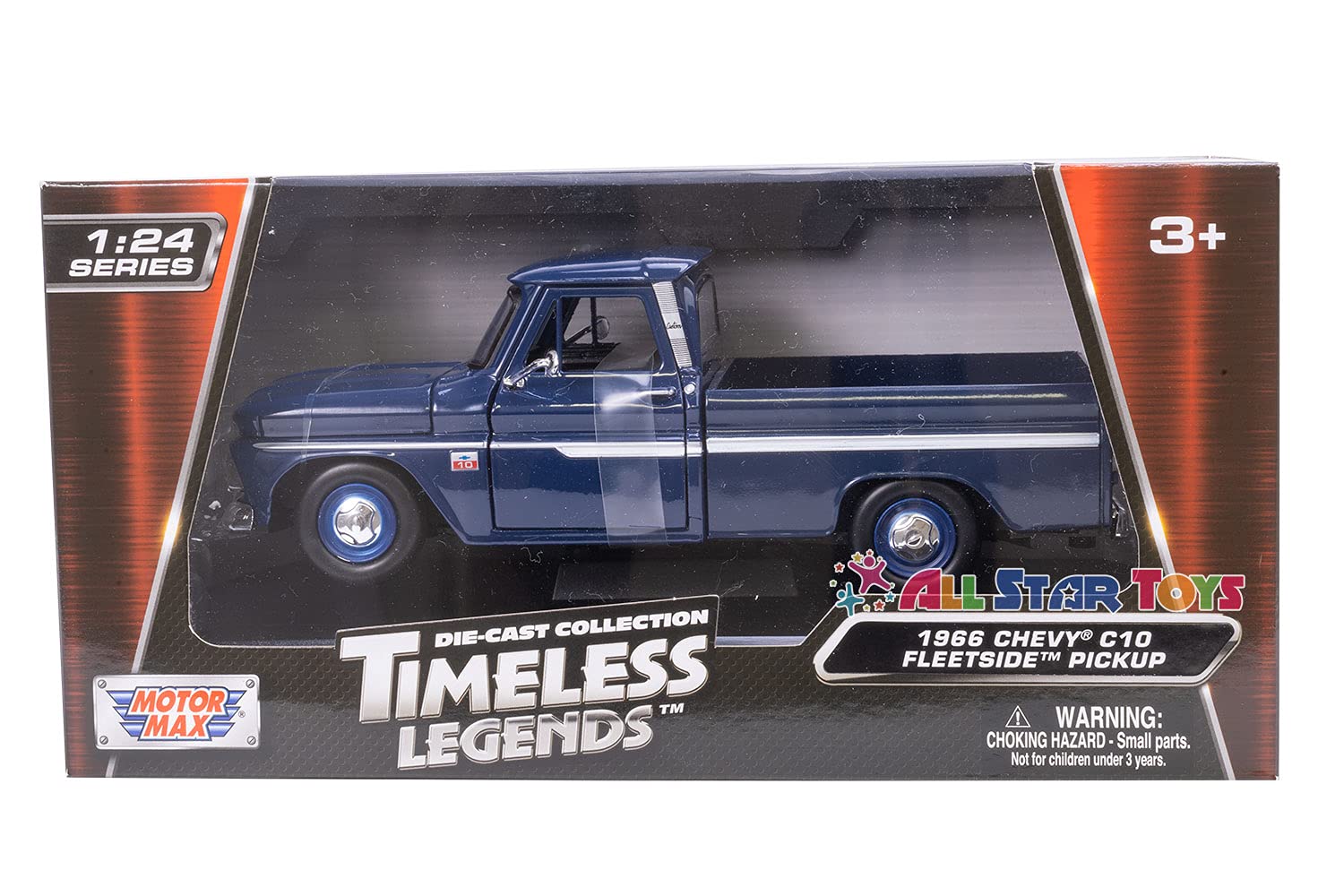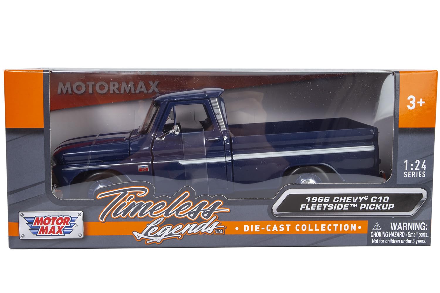 Looking for a rugged ride, old-style? Jump on the 1966 Chevy C10 Fleetside Pickup truck and experience the thrill of riding an all-steel mule. The '66 Chevy C10 comes with a restyled grill and distinct front fenders. Under the hood lies a 250 6-cylinder engine ready to power this mule to haul away anything you throw at it! Dark blue in color, this '66 Chevy C10 Fleetside Pickup Truck is a 1/24 diescale replica, with openable doors, hood, and steerable front wheels. -- 73355 Motormax Premium American Classics - 1966 Chevy C10 Fleetside Pickup truck. -- 1/24 scale diecast collectible model car. 7.5"L x 3.25"W x 2.75"H. -- Openable doors & hood, steerable front wheels. -- This 66 Chevy C 10 Fleetside Pick up is manufactured by Motor Max Toys. -- DARK BLUE color. -- Individually packed in a window box. Box size: 9.75"Lx 4.5"Wx 4"H. -- GM is a trademark of the General Motors Corporation.