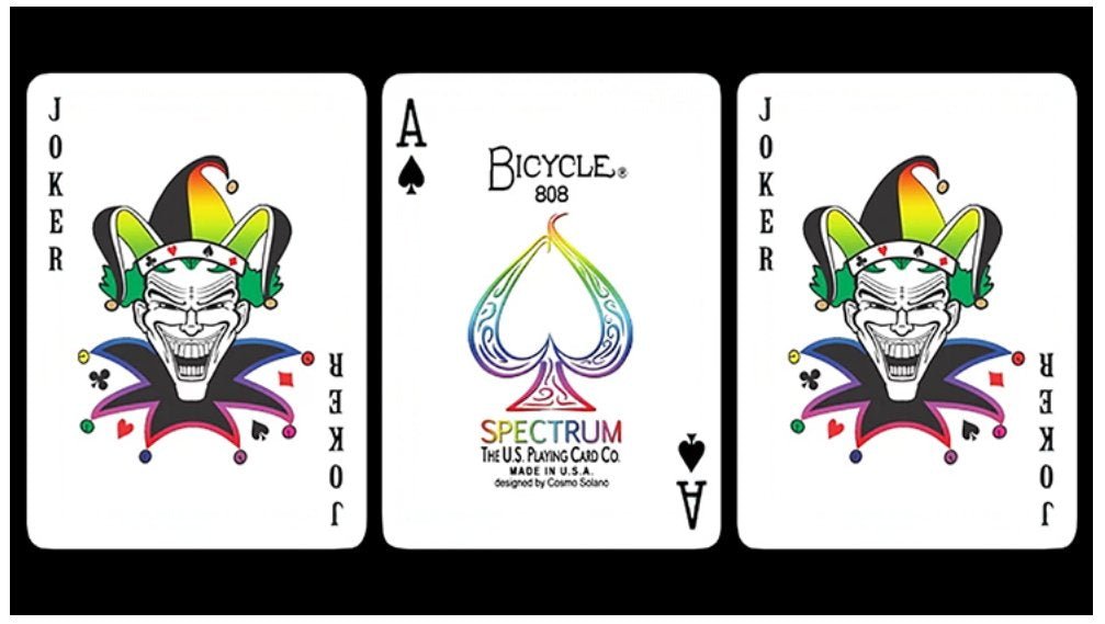 This is a standard deck of playing cards with 52 different colored backs. This deck was designed to take you from one end of the rainbow spectrum to the other, thus the creation of 52 uniquely colored and different, rider backed playing cards. The deck was designed by Cosmo Solano, magician and creator. The deck also features a custom ace of spades and 2 custom jokers. In addition, Magic finish was used to give this deck extra durability and improved handling.