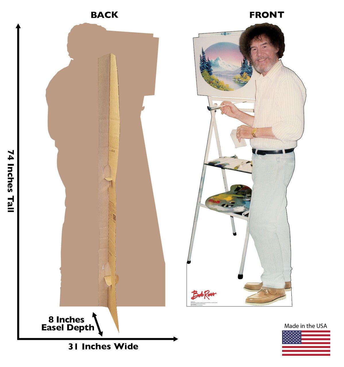 Description: This is a life-size cardboard cutout of Bob Ross, everyone's favorite artist with an afro! It features a high quality print and an easel on the back so that it can stand alone. This is one "happy little cutout" you'll love to have. It's great for galleries, painters, and parties. Order yours today!