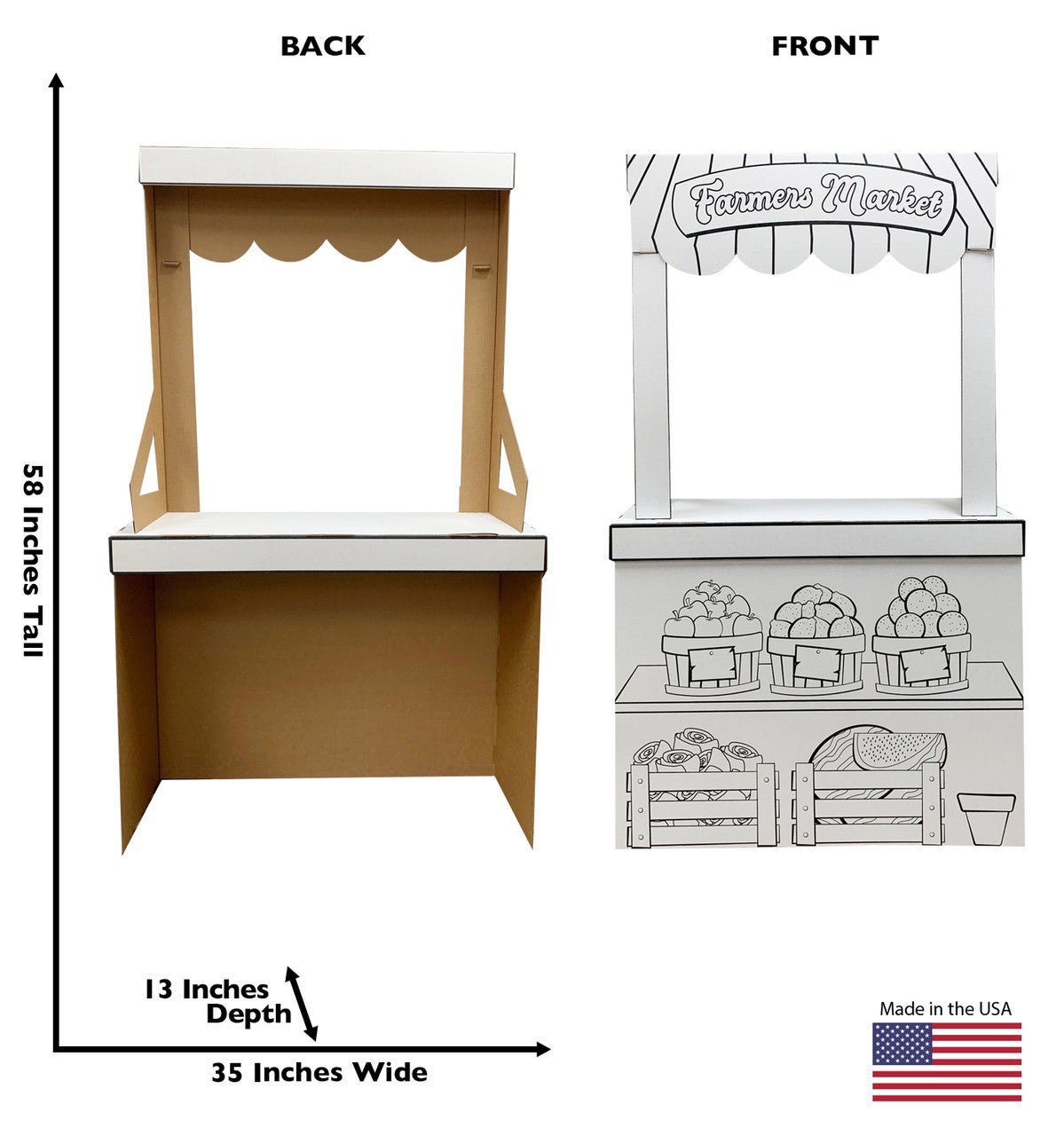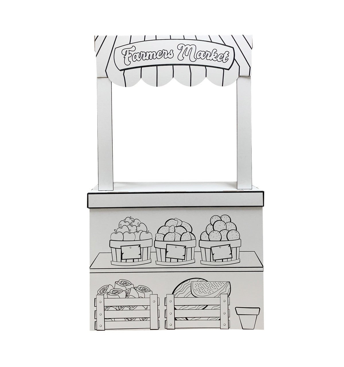 Description: This is a child size cardboard Color Me Farmers Market Stand! First your child gets to have a blast decorating with markers, crayons or paint. Then when it is complete it becomes the perfect accessory for pretend play at home. It's a great opportunity to teach about where our food comes from, eating healthy as well as letting kids practice handling money, math, and social skills. Lightweight and easy to assemble, this product features a high quality black/white print on cardboard that you can color at home. Note: not designed for bearing heavy loads.