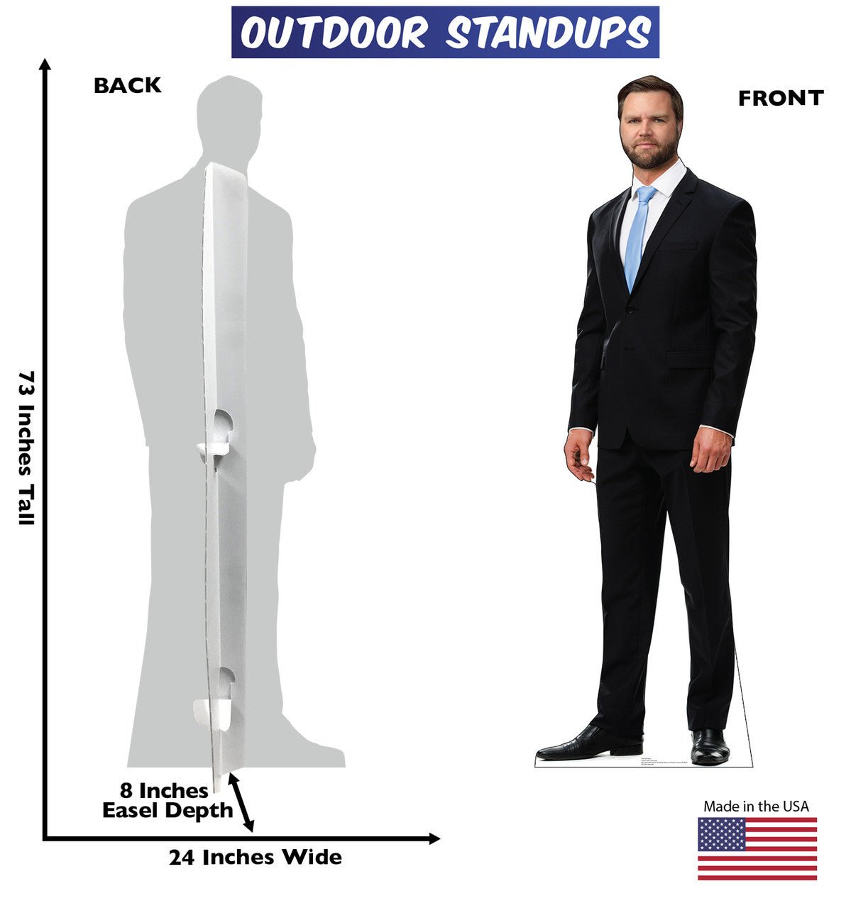 Description: This is a life-size outdoor coroplast standee of JD Vance. They are made of weather resistant corrugated plastic and come with yard stakes so that they are free standing. Works great outdoors on grass or soft soil. What a great way to make a BIG, statement outside your home or business!