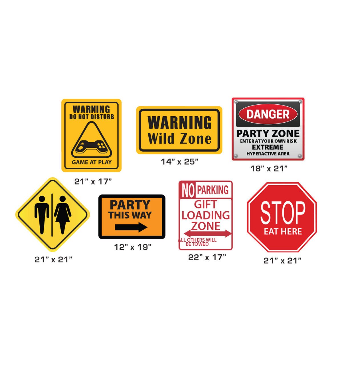 Description: This is a set of cardboard Party Construction Signs. Each features a single-sided high quality print on cardboard. Great décor for birthday parties, photo-ops and events! 7 Signs 18" x 21", 21" x 21", 14" x 25", 22" x 17", 12" x 19", 21" x 17" & 21" x 21"