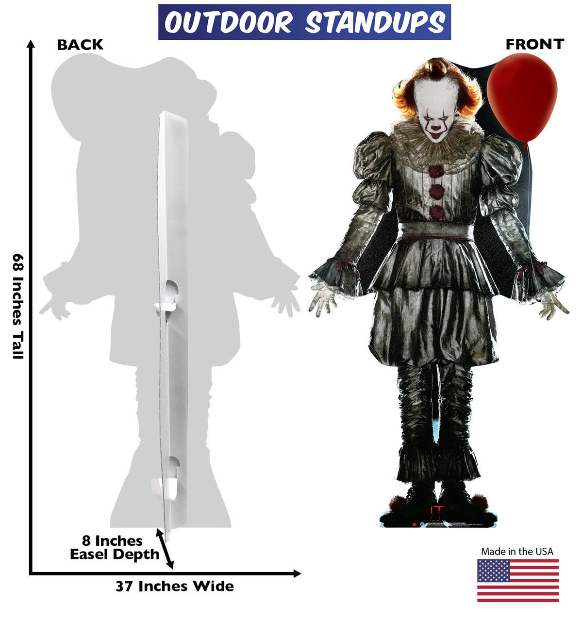 Description: This is a coroplast outdoor cutout of Pennywise with Balloon the Clown from IT Chapter 2, 2019 Warner Brothers film. It features a singled-sided, high-quality print on coroplast with an easel on the back and yard stake so it can stand on its own. Cardboard cutouts make great decor for Halloween parties, photo ops, and events! Order yours today!