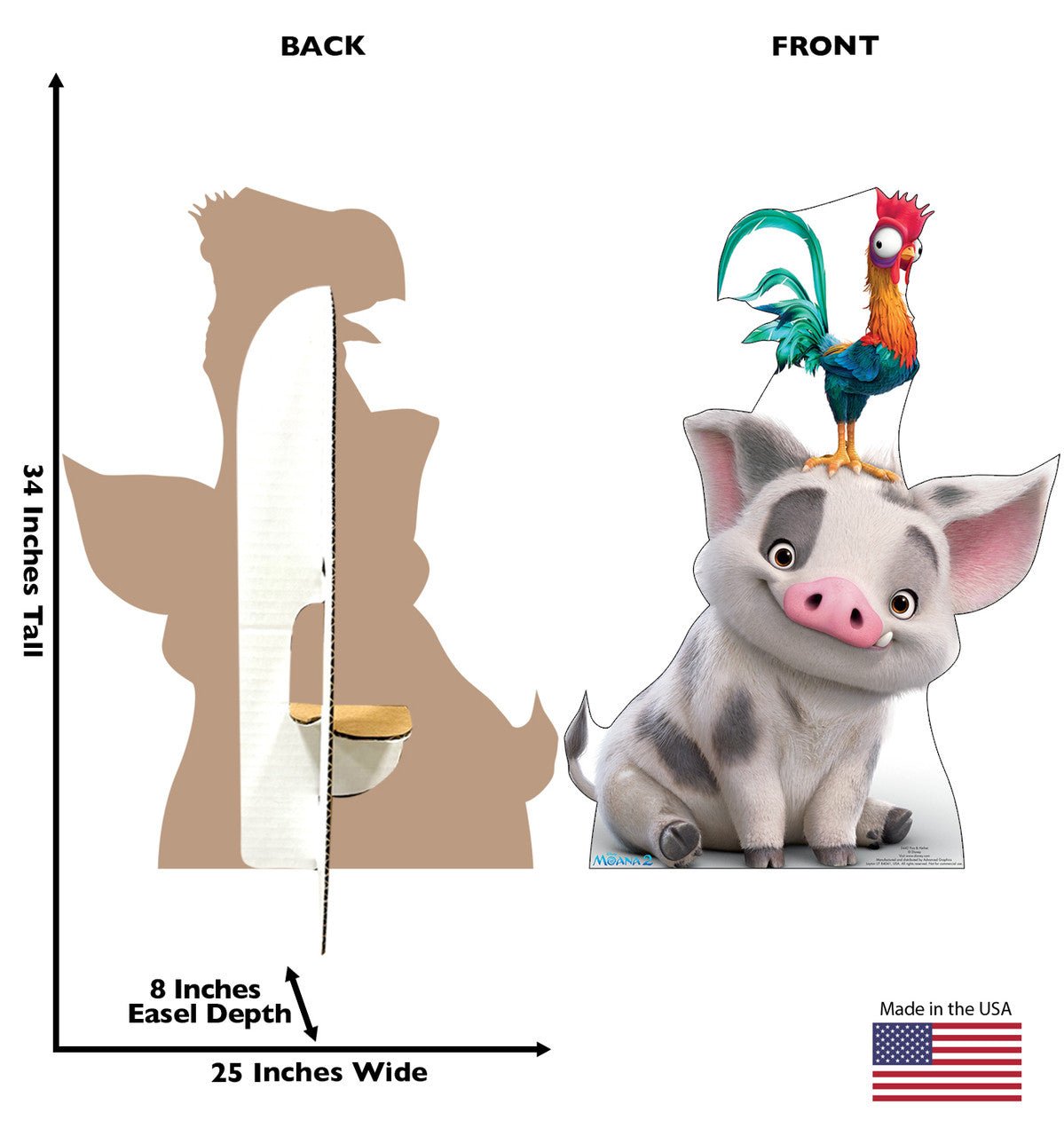 Description: This is a cardboard cutout of Pua & Heihei from Disney's Moana 2. Easy to set up, it features a single-sided, high-quality print on cardboard with an easel on the back so that it can stand on its own. Cardboard stand-ups make great decor for parties, photo ops, and events. Order yours today!